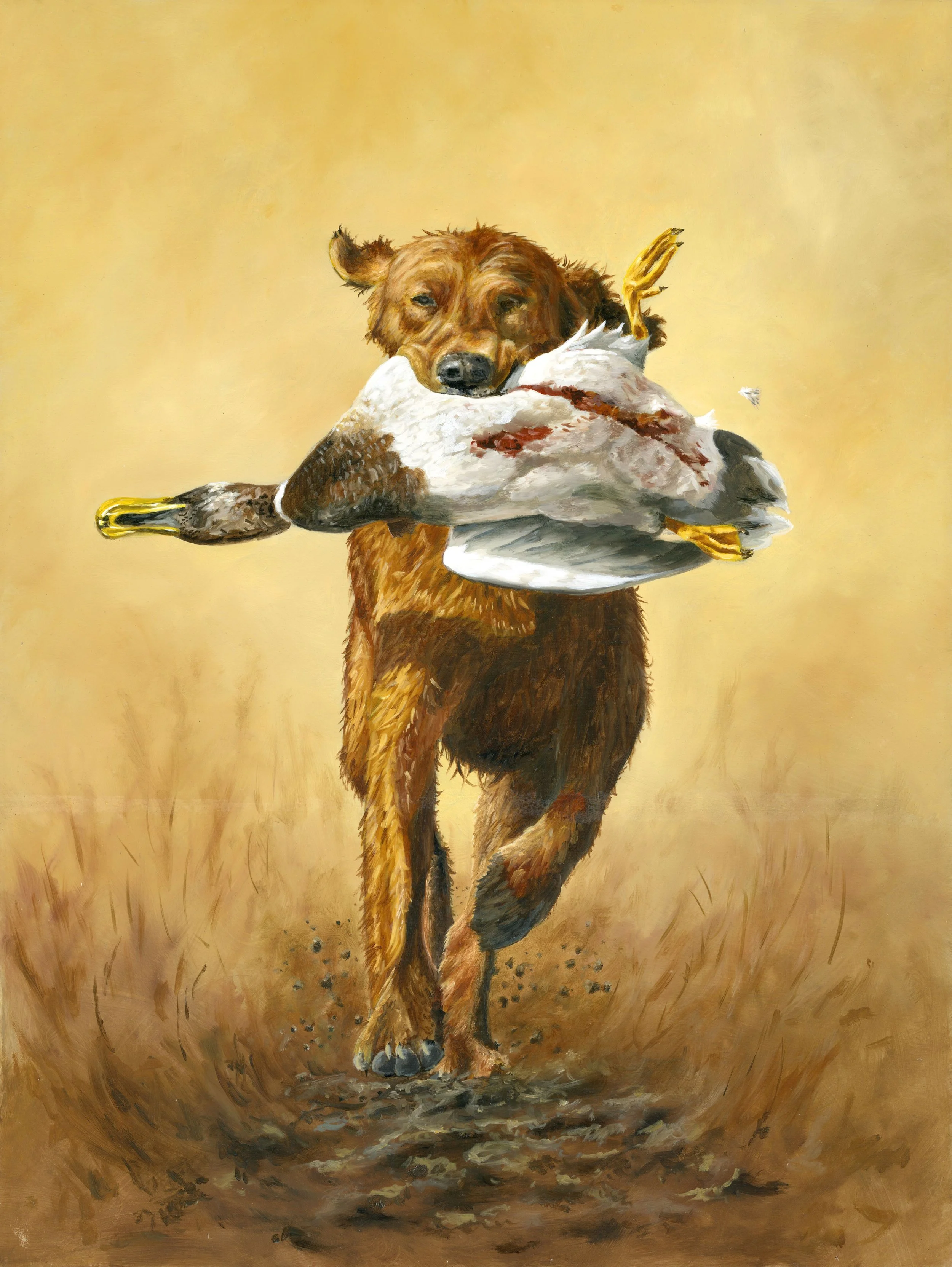 An oil on panel painting of a working cocker spaniel returning after a pick up