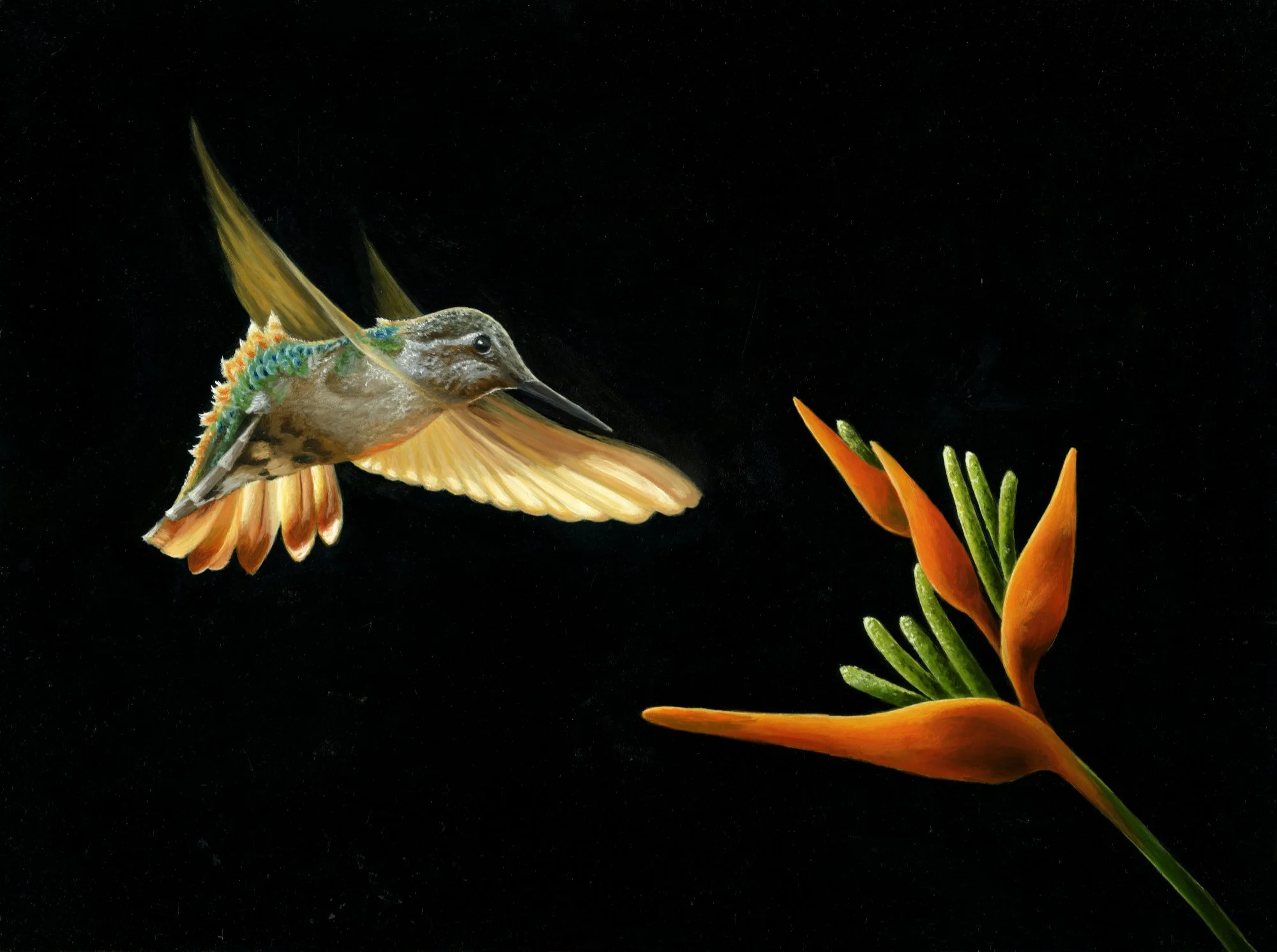 An oil on panel painting capturing the moment a kingfisher leaves the water after catching a fish.