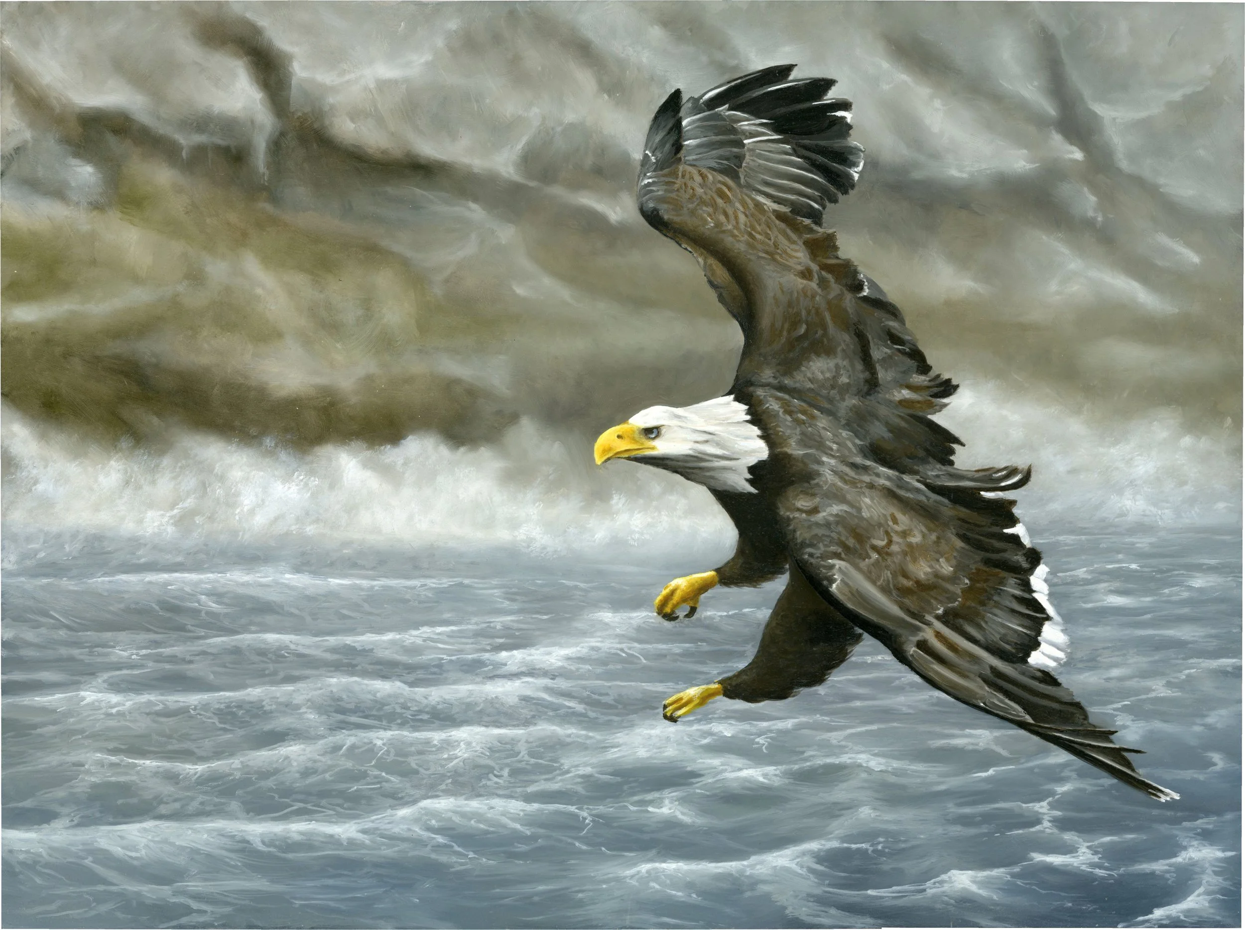 An oil on panel painting depicting a golden eagle hunting along the coast.